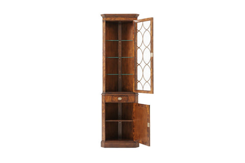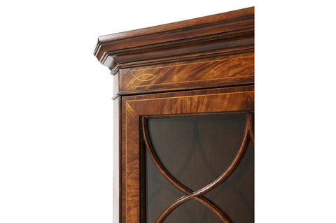 A mahogany and flame veneered corner cabinet, the upper section with an astragal glazed door enclosing lights and three glass adjustable shelves, a...