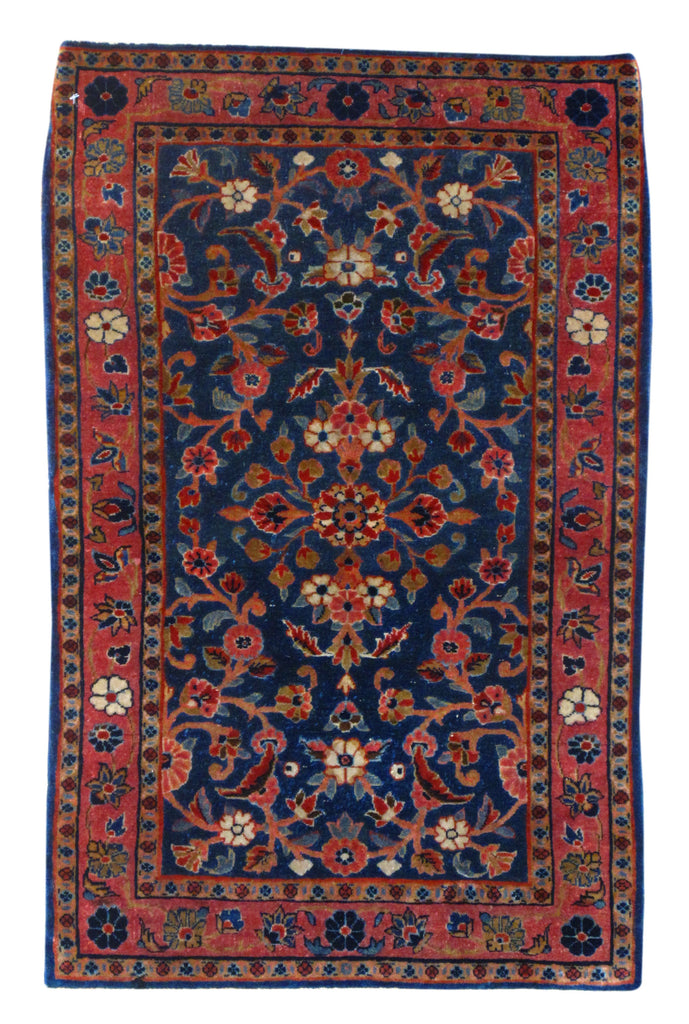 Exteremy Fine Antique Persian Kashan Manchester Wool Embossed Design - BG Color: Mid Night Blue - BR Color: Red - Size: 1'11" x 2'11" - Wool on Cot...