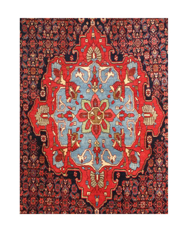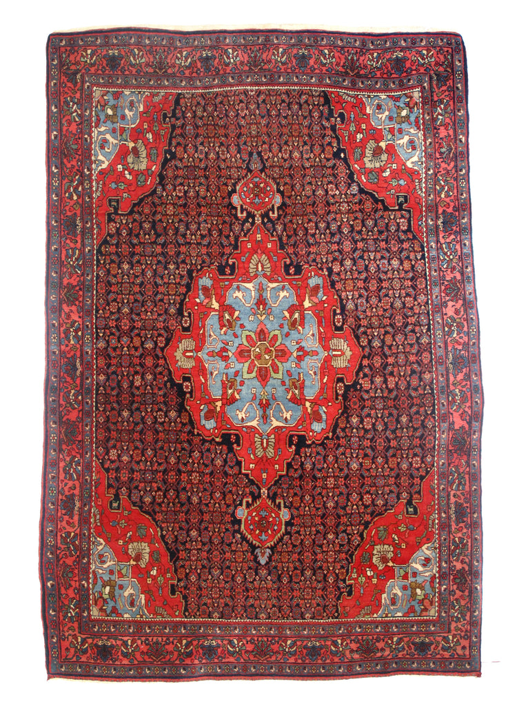 Fine antique Persian Bijdar - BG Color: Navy/Red/Light Blue - BR Color: Rose - Size: 4'9" x 7'1" - Wool on Cotton.