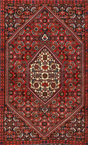The lipstick red hexagonal sub- field of this well-woven scatter shows an allover Herati design matching the pattern of the navy field as manifeste...