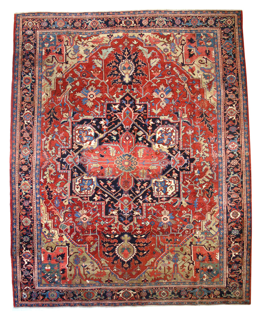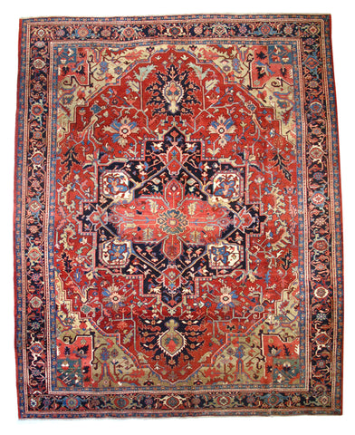 Fine Antique Persian Heriz Serapi - BG Color: Red/Navy/Yellow - BR Color: Navy - Size: 9'2" x 11'8" - Wool on Cotton.