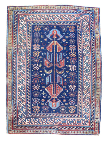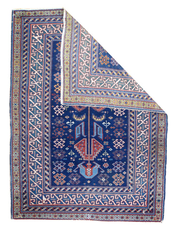 Fine Antique Russian Shirvan - BG Color: Blue - BR Color: Ivory - Size: 3'7" x 4'11" - Wool on Wool.
