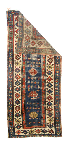 Fine Antique Talysh - BG Color: Blue - BR Color: Ivory - Size: 3'2" x 7'8" - Wool on Wool.