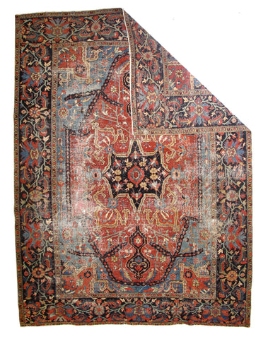 Fine Untouched Antique Heriz Serapi Persian - BG Color: Light Blue/Red - BR Color: Navy - Size: 8'7" x 11'5" - Wool on Cotton.