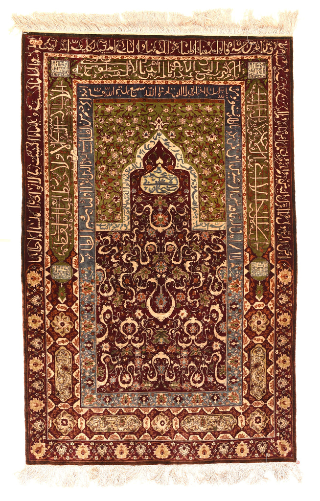 This calligraphy – laden, very finely woven piece from Hereke near Istanbul precisely mimics the later 16th century pieces, now mostly in Turkish m...