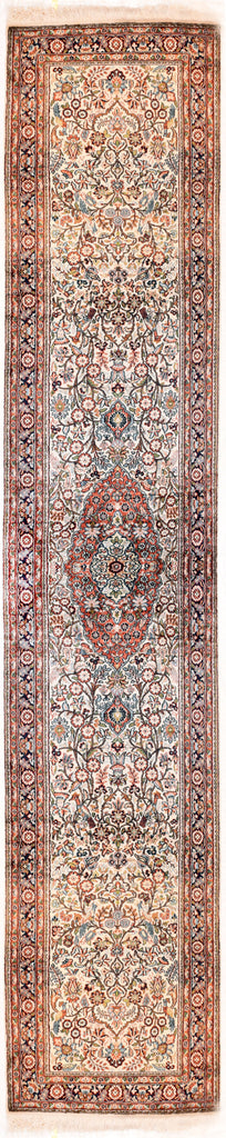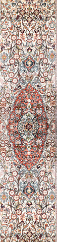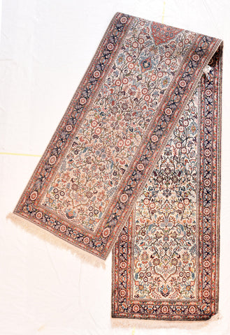 This very useful narrow runner from northern India features a flowing tendril and petalled daisy doubled rosette pattern on an ecru ground, acce...