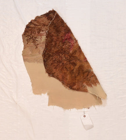 Originally a fine.ly woven chair set covering, this is a pictorial landscape piece in toners of cream, red, light red, buff sand spots of powder bl...