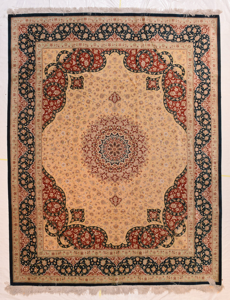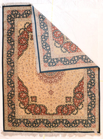 Central Persian well-woven small carpet/large scatter with a straw/ blood red / navy palette. The broad straw field of this short pile, intensely d...