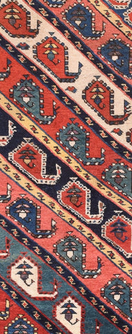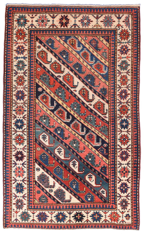 In the general Genje style with a field divided intyo diagonal bands in off white, green, red, rust, black and blue, with simple angular botehs in...