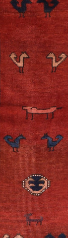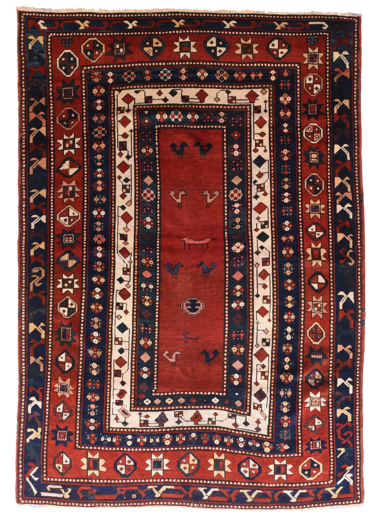 This is a so-called ‘Lambalo’ Kazak scatter from the SW Caucasus with a very narrow red field spottily ornamented with birds and an animal, an embe...