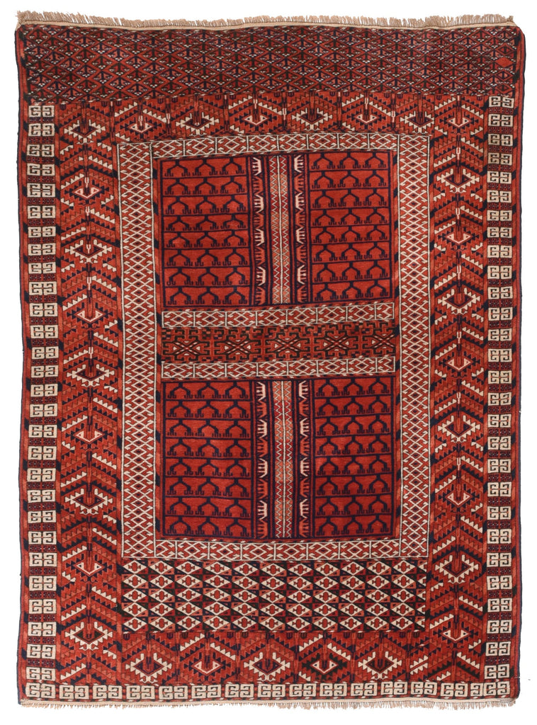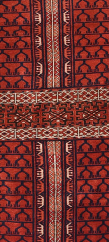 The four panel red field design is characteristic of many types of Turkmen door rugs (engsis). Usually those of the large Tekke tribe show a niche ...