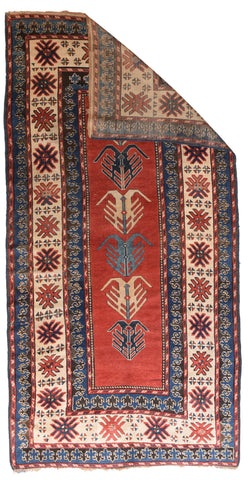 The warm, glowing, faintly abrashed mature madder red field displays exactly six obliquely rayed and voluted “bug” palmettes in brown-black, mediu...
