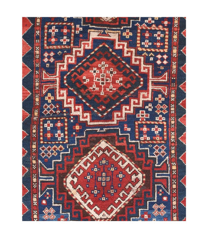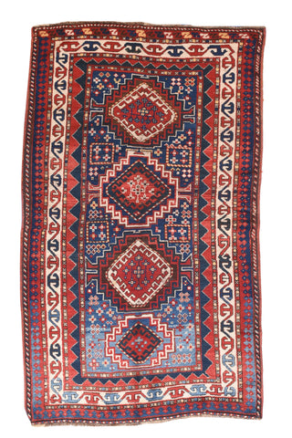 The field attractively abrashes from sky blue to cerulean to royal blue and displays three large and one slightly smaller stepped, nested octagonal...