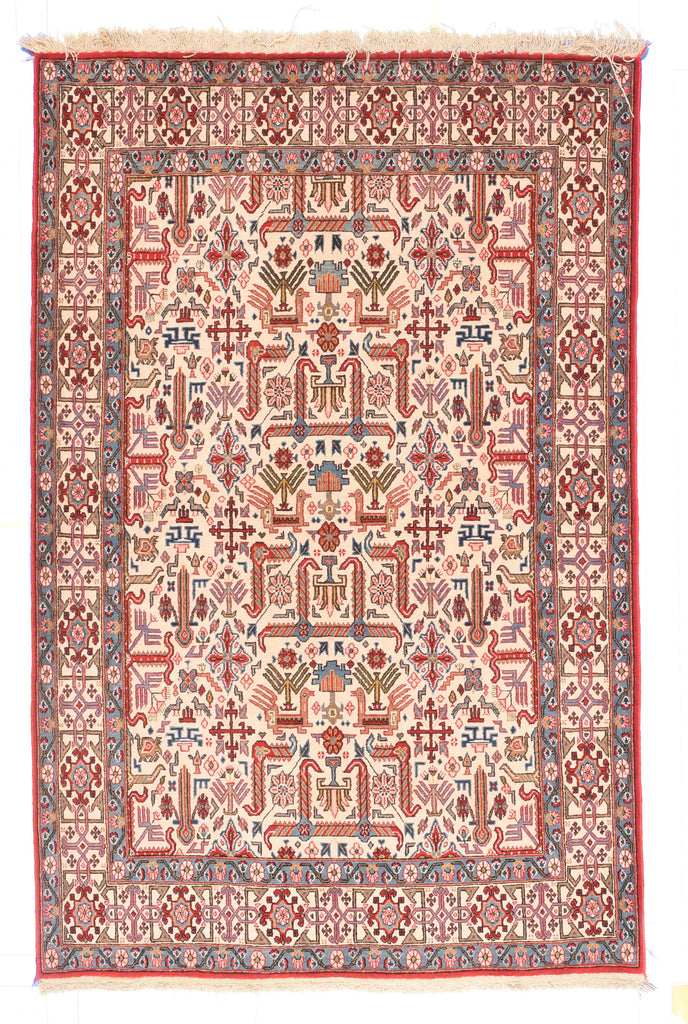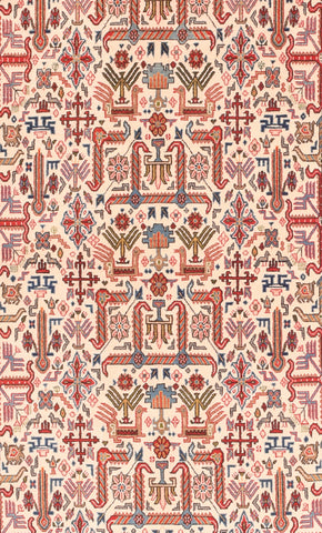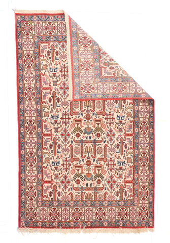 This post-WWII central Persian scatter has a neo-Caucasian design on an ecru field of right-angle “goosenecks” and small birds (probably peacocks...