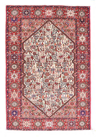 The indented pointed ivory hexagonal subfield displays leaves, flowers and oblique vines in a semi-geometric manner on this well-woven asymmetrical...