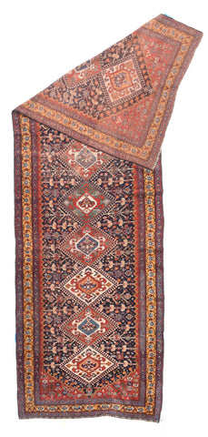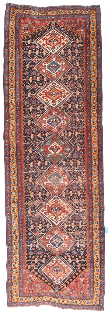 The navy field hosts a pole medallion of nine equal, hooked lozenges in red or ivory, each centred by the “Qashghai gul” derived from the turtle pa...