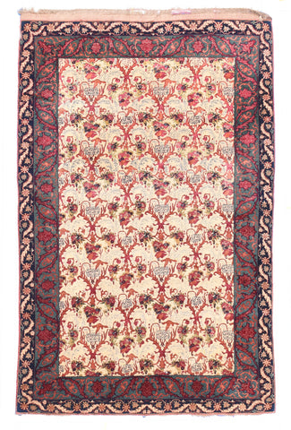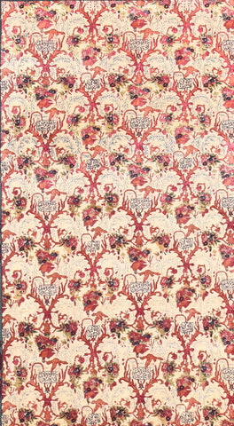 A unidirectional double, diverging leaf and stylised rose design forms a semi-lattice on the creamy sand field, detailed in reds and greens, in an ...