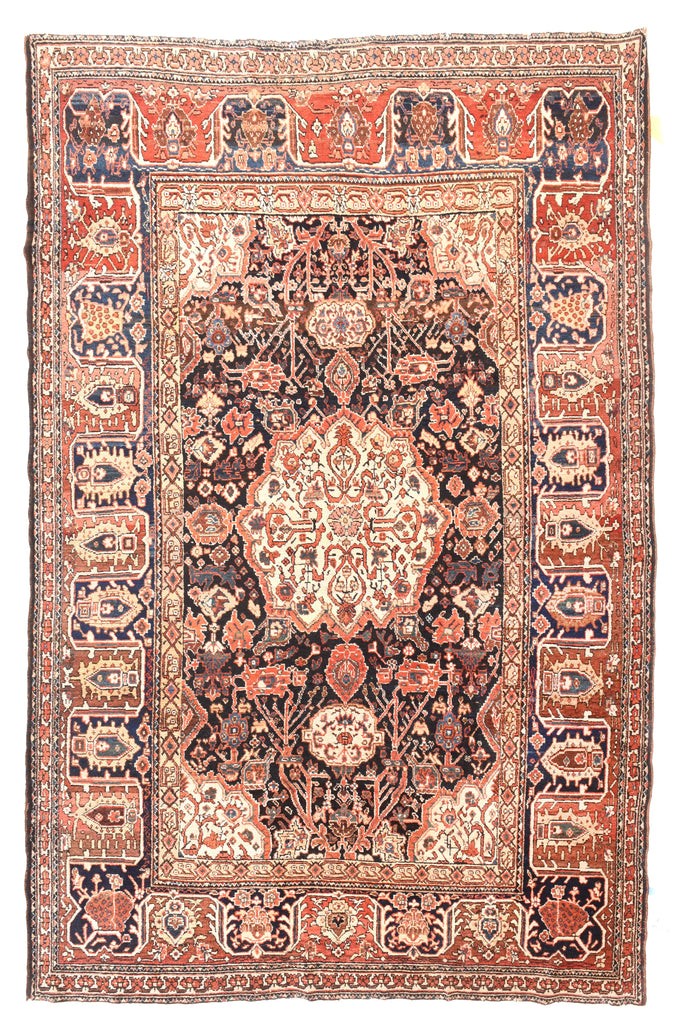 The Pattern on this central Persian rustic carpet is distantly derived from classical archetypes with a clouds band dominated lobed and pointed ivo...