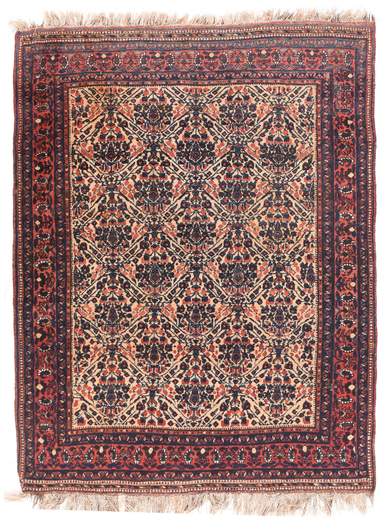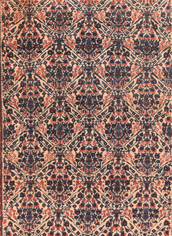 Now this is a true SE Persian antique tribal Afshar scatter with an ecru field displaying a lightly latticed one way half-drop, offset repeating cy...