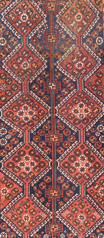 From a neighbouring tribal group to the Qashghai of SW Persia, this all-wool construction long rug shows two columns each of five hooked diamonds,...
