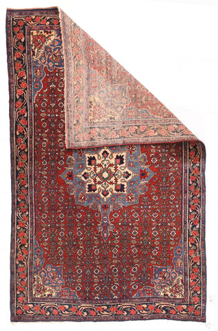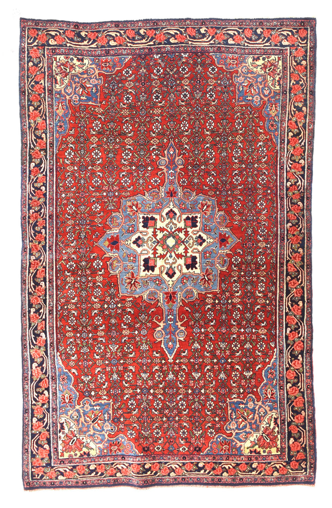A teal blue spearhead finialed octogramme medallion enclosing a conforming cream submedallion with radiating palmettes, floats on the close red Her...