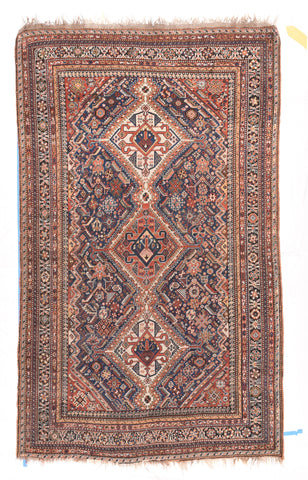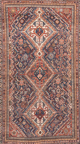Probably from the Rahimlu Qashghai suibtribe as indicated by the bracket and rosette main border, this SW Persian long tribal scatter shows an ivor...