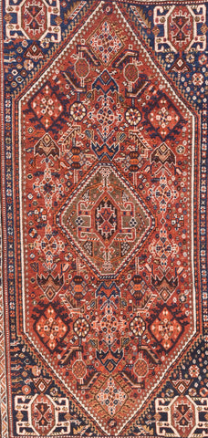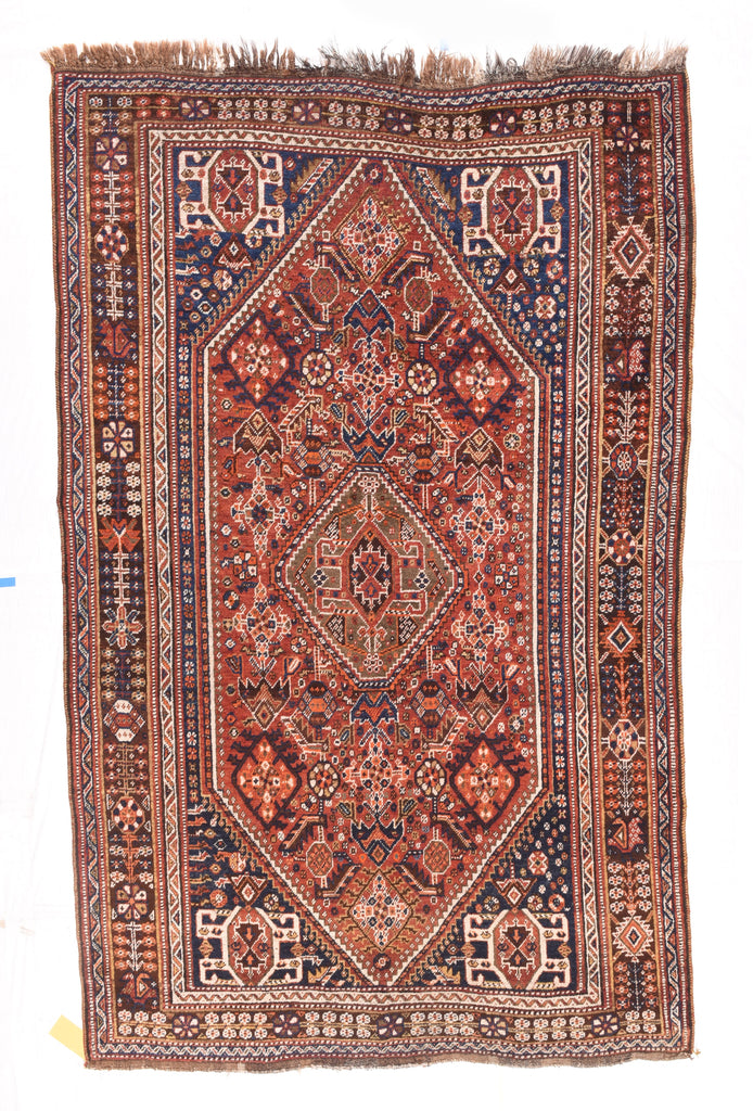 This moderately woven southwest Persian nomadic large scatter presents a very dark blue field with stylized “Qashghai gul” corner medallions, overl...