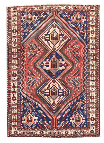 A pole medallion of three bnest4ed, stepped, conjoint octagons in old ivory and royal blue, with angular “Qashghai gul” centres dominates the lipst...
