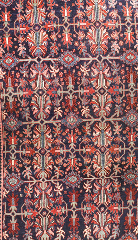 The rich indigo navy field shows an end-to-end, two column layout of paired, facing thin petal palmettes in a suggested square lattice with blue la...