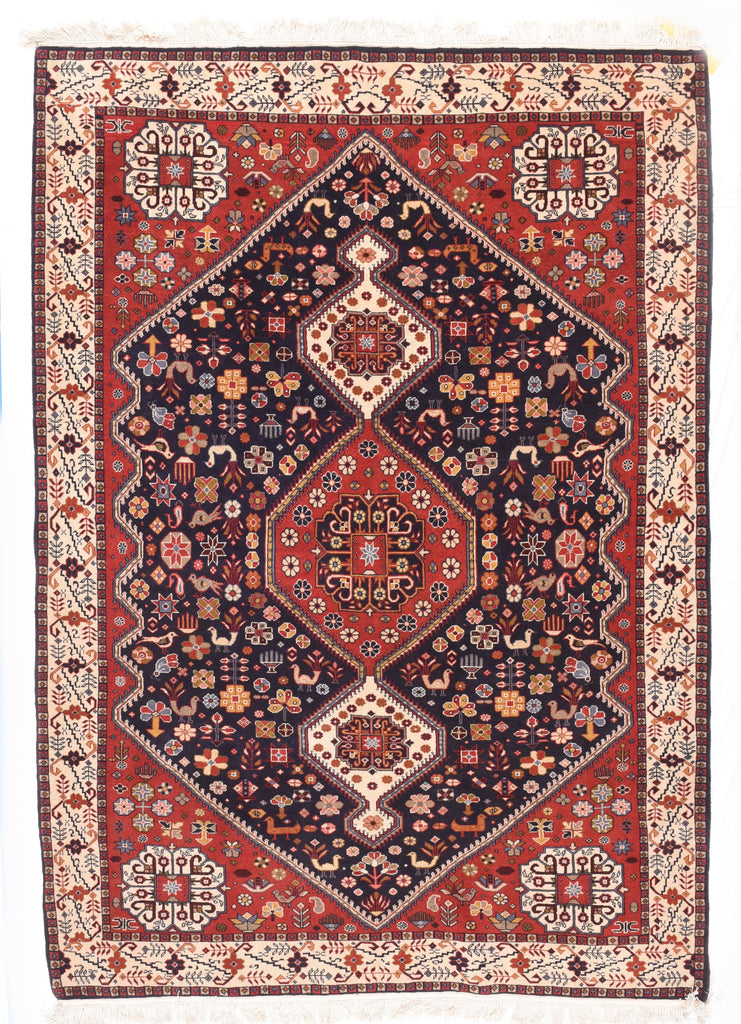 Maybe from the Qashquli subtribe of the Qashghai, noted for extremely well-woven and designed rugs. The deep indigo blue navy sdubfield is filled w...