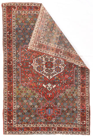 The delightfully abrashed green field is filled with randomly coloured small rosettes, and hosts a red stepped medallion with gigantic tonally en ...