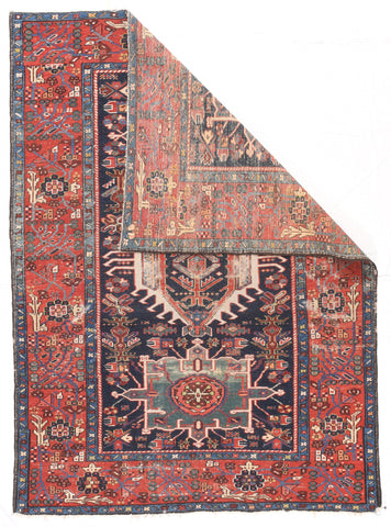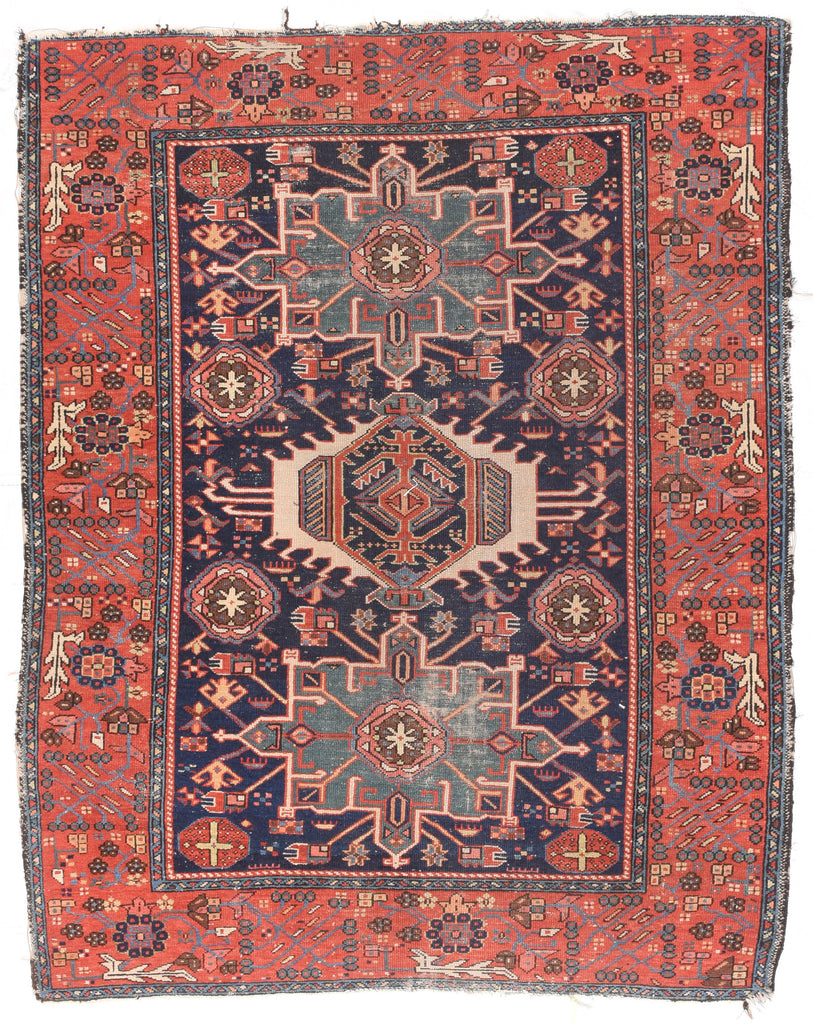 With significant end loss, this rustic NW Persian scatter is a close pendant to our 629, but with Caucasian-style green and red rosettes in place o...