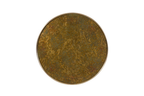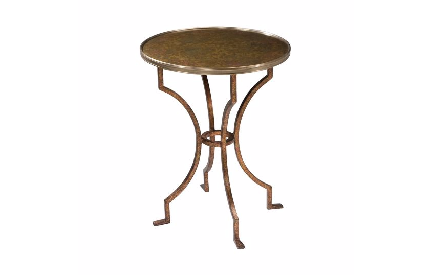 An antiqued wrought iron and iridescent gilded verre églomisé lamp table, the circular brass bound top above inswept legs joined by a circular cent...