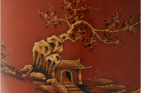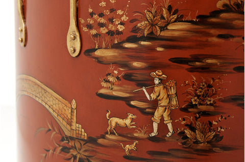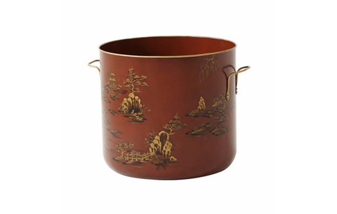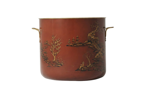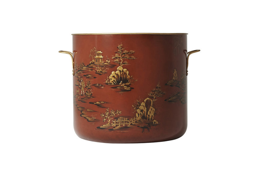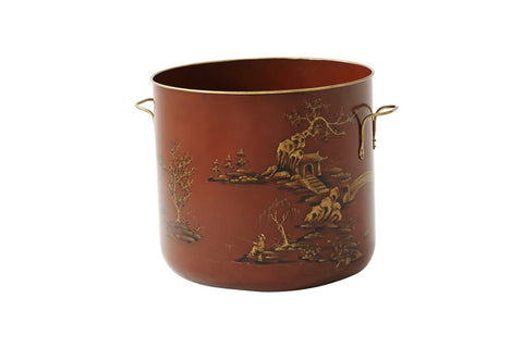 A finely hand painted tôleware jardinière, the circular red painted and Chinoiserie decorated steel jardinière with bras carrying handles.