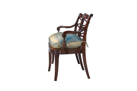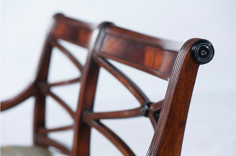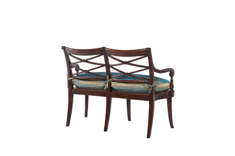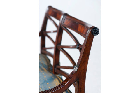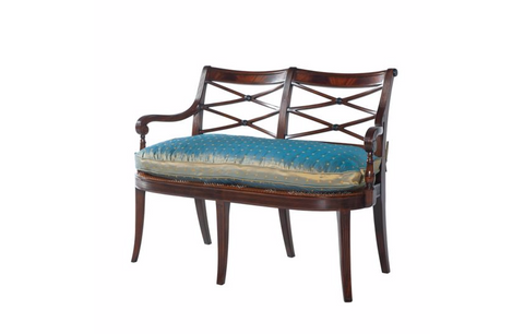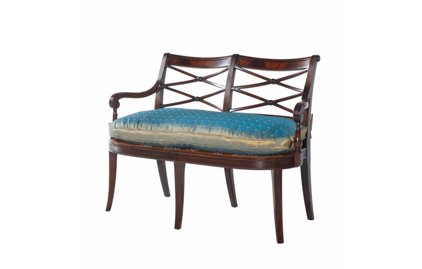 A hand carved and caned double chair back settee with curved and ‘X’ backs, sabre legs, scroll arms and silk cushion seat. The original Regency.Uph...