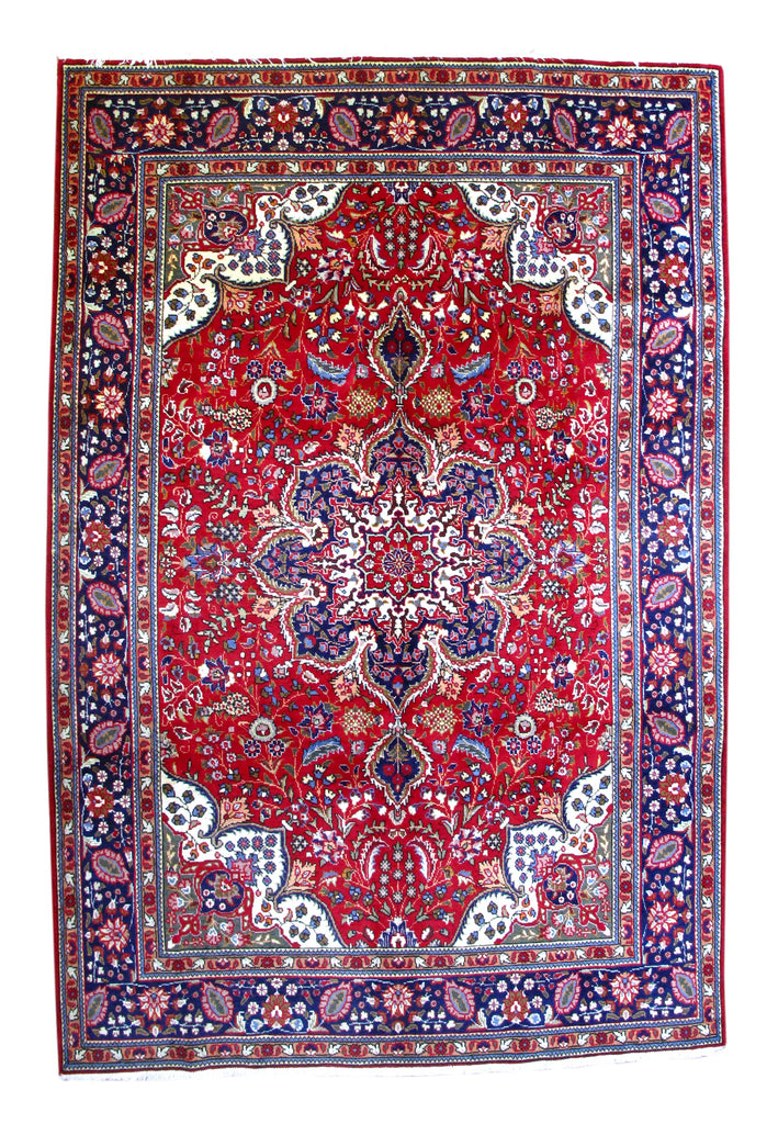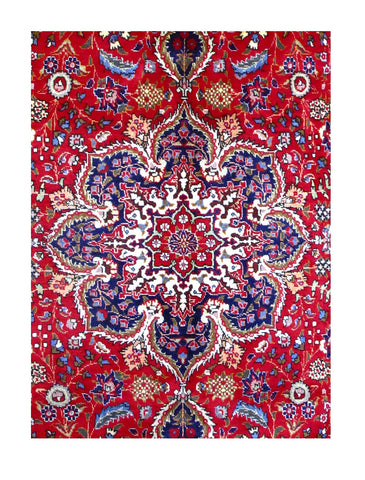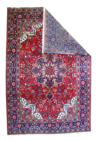 Semi antique Persian Tabriz - Background Color: Red/White/Blue - Border Color: Blue/Red - Size: 6'7" x 9'10" - Wool on Cotton.